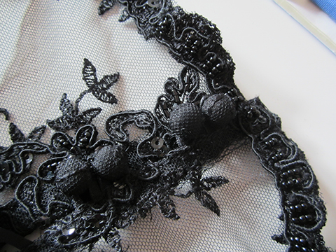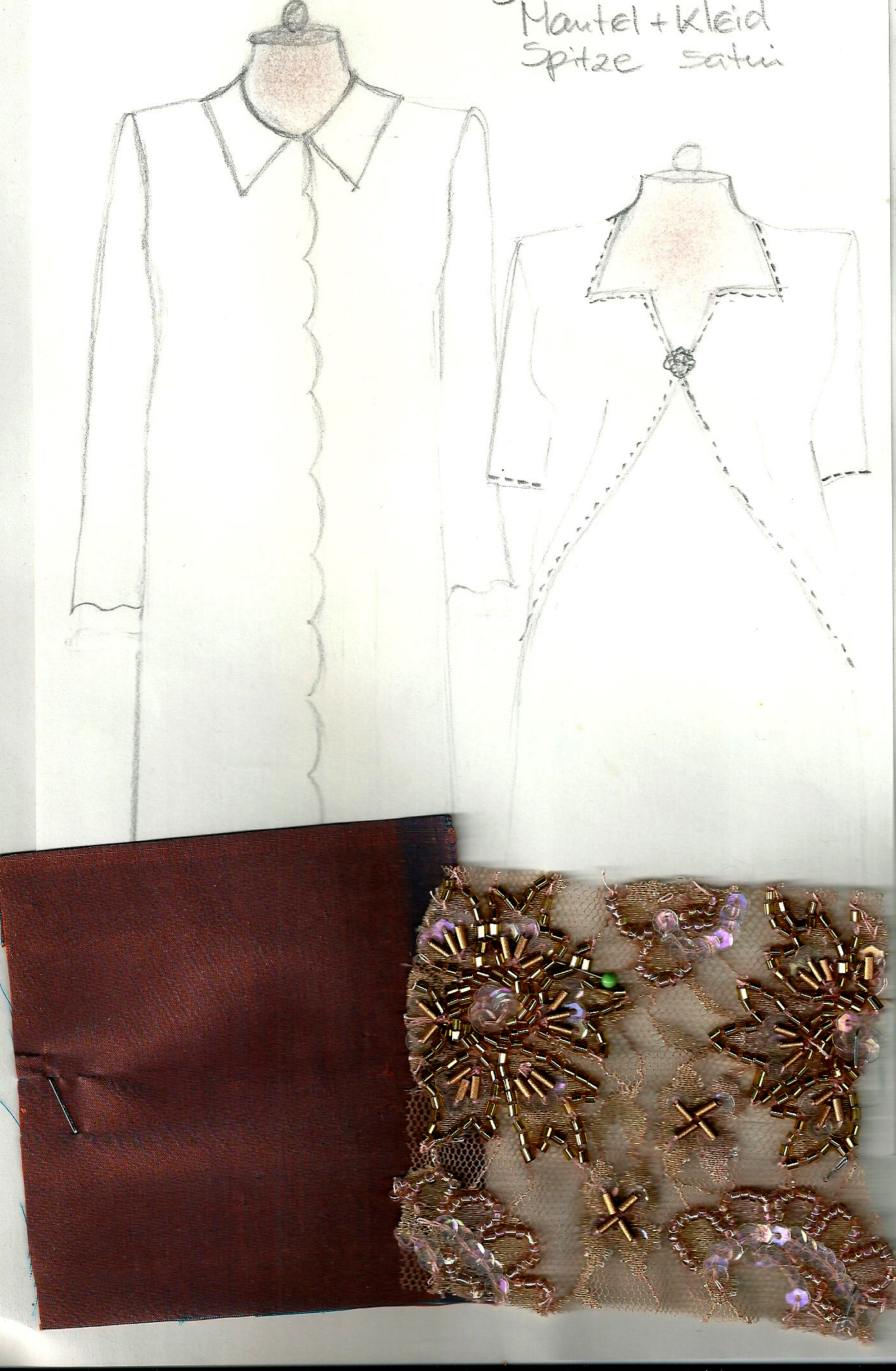 Nach der Anprobe wird das gesteckte Modelles nach einem bestimmten Kennzeichnungssystem abgeändert. Futter, Belege, Taschen, Krägen etc. werden jetzt zugeschnitten und verarbeitet. Verschlüsse, wie Knopflöcher oder Reisverschlüsse arbeite ich jetzt endgültig ein. Säume werden nun fertig gesäumt, Futter einstaffiert, Spitzen oder Perlenstoff auf Ausschnitte von Hand appliziert.