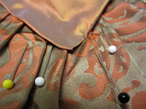 Bei der Anprobe wird die Weite an den Nähten abgesteckt, die Länge abgerundet und Details besprochen. Dazu gehört z.B. der Sitz einer Klappentasche, die Anzahl und der Abstand der Knöpfe oder andere gewünschte Finessen. Auch werden Verzierung, Bänder, Rüschen etc. veranschaulicht angesteckt, insofern das Modell dieses vorsieht.